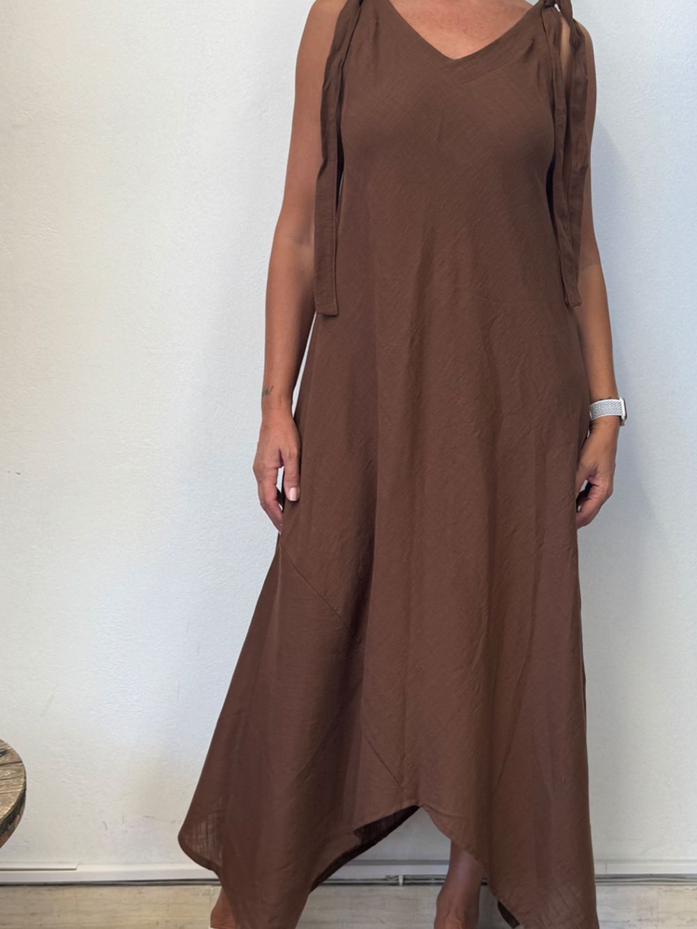 εντυπωσιακό μακρύ ασύμμετρο φόρεμα με δεσίματα στους ώμους
