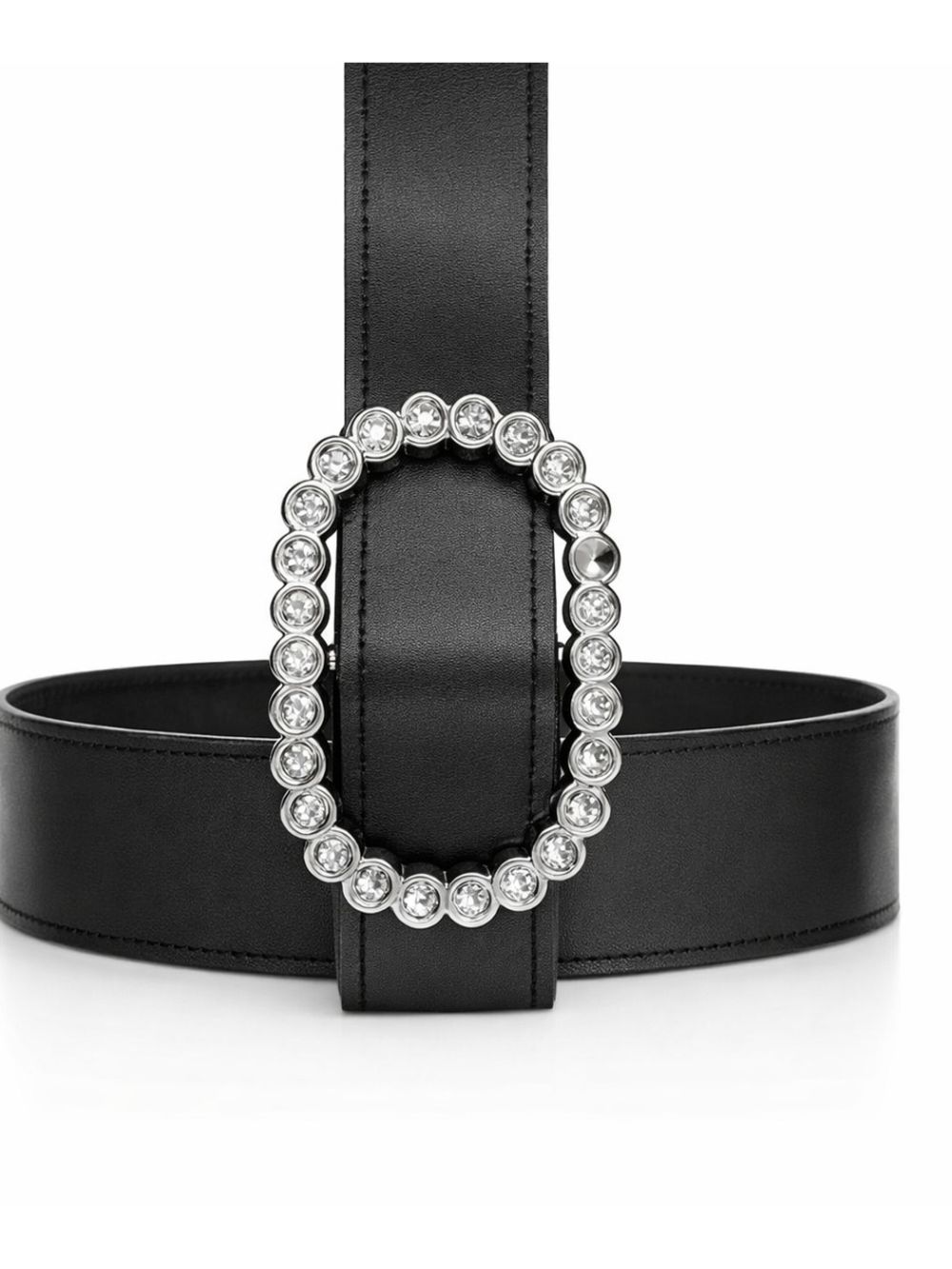 Κομψή μαύρη ζώνη από δερματίνη υψηλής ποιότητας, με εντυπωσιακή οβάλ αγκράφα διακοσμημένη με λαμπερά στρας σε ασημί μεταλλικό πλαίσιο. Προσθέτει λάμψη και στυλ σε κάθε εμφάνιση, από καθημερινά outfits έως πιο βραδινές εμφανίσεις. Ιδανική για να αναβαθμίσει φορέματα, παντελόνια και σακάκια με μία μοντέρνα και θηλυκή πινελιά.